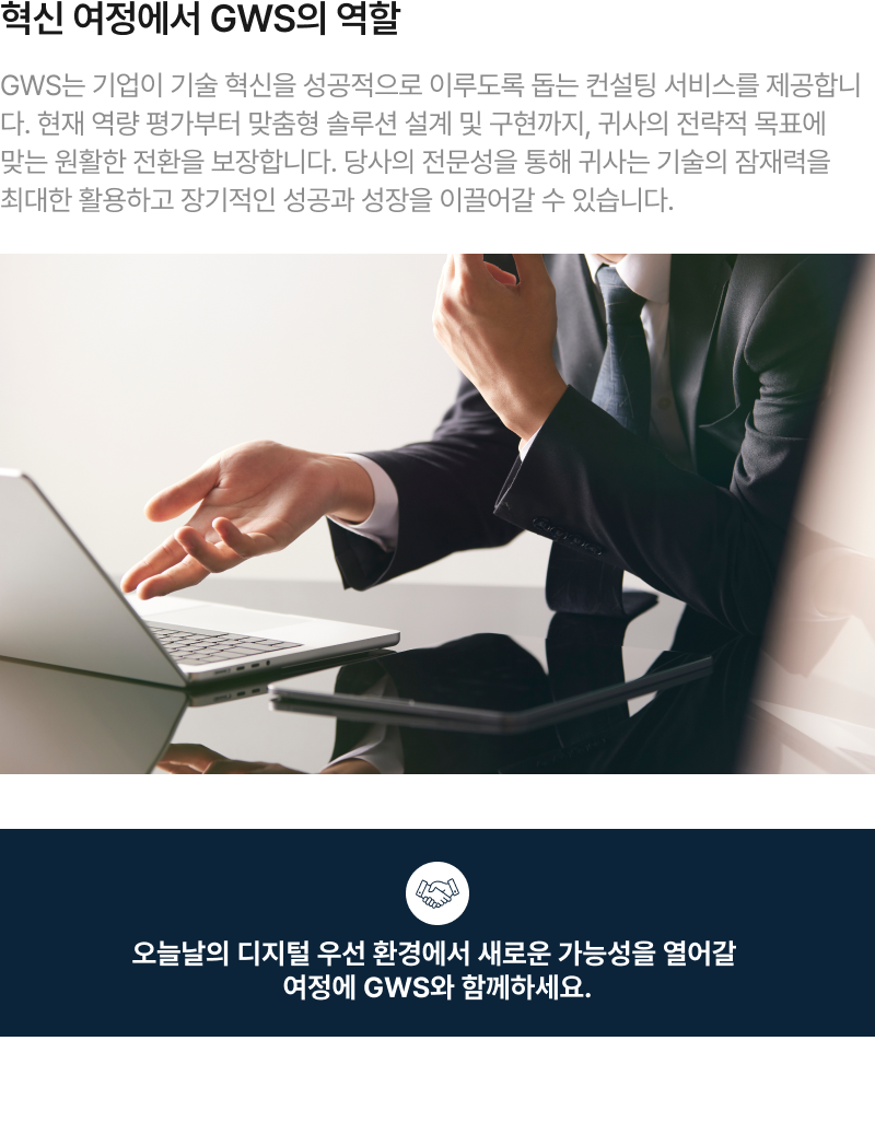 “GWS International은 다국적 기업의 비지니스를 지원하는 맞춤형 ICT 솔루션을 제공합니다. 원활한 네트워크 통합과 연결부터 안전한 SD-WAN 및 SASE 솔루션까지, 한국으로 진출하는 다국적 기업과 글로벌로 확장하는 한국 기업의 성공을 돕습니다. 인프라, NaaS, 그리고 엔드투엔드 ICT 서비스 분야에서 축적된 전문성을 바탕으로, 귀사 비지니스 성장과 안정성을 이끌어낼 수 있도록 최선을 다하겠습니다.”