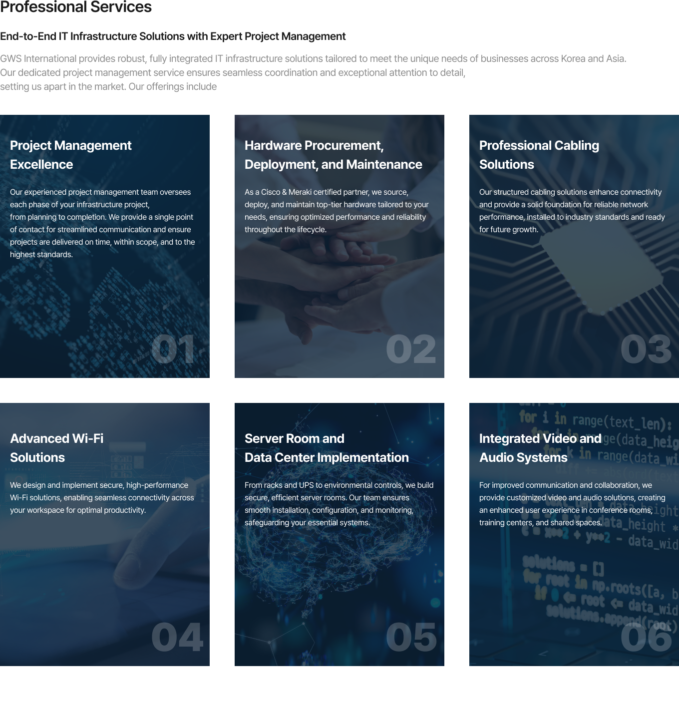 “At GWS International, we deliver tailored ICT solutions that empower businesses globally. From seamless network integration and advanced connectivity to secure SD-WAN and SASE solutions, we support multinational companies entering Korea and Korean enterprises expanding worldwide. Our expertise in infrastructure, NaaS, and end-to-end ICT services ensures your technology drives growth and reliability.”