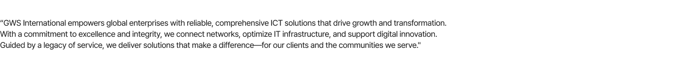 “At GWS International, we deliver tailored ICT solutions that empower businesses globally. From seamless network integration and advanced connectivity to secure SD-WAN and SASE solutions, we support multinational companies entering Korea and Korean enterprises expanding worldwide. Our expertise in infrastructure, NaaS, and end-to-end ICT services ensures your technology drives growth and reliability.”