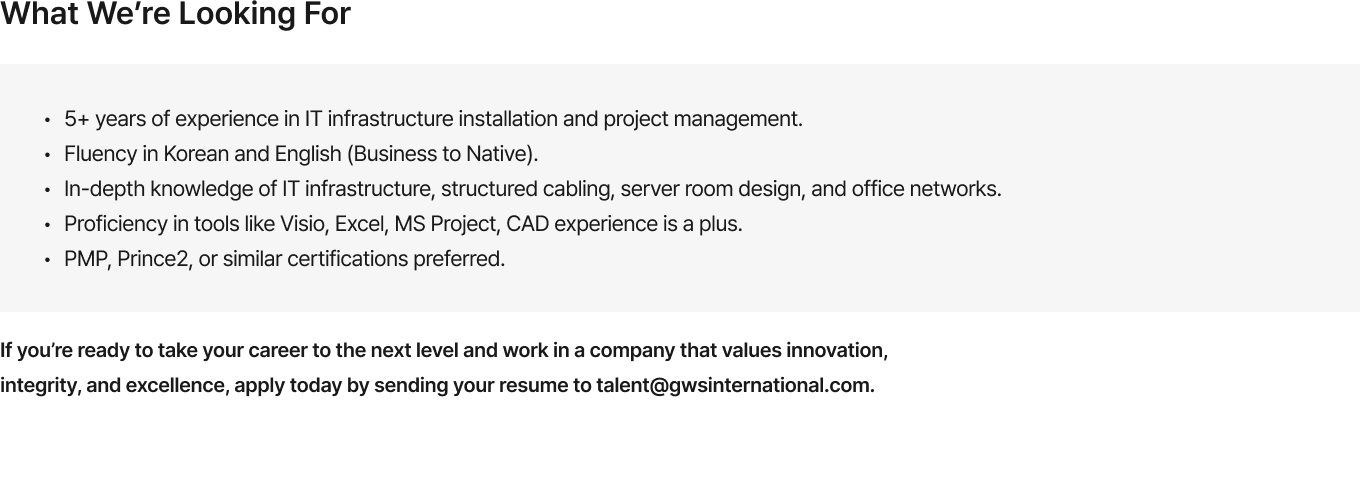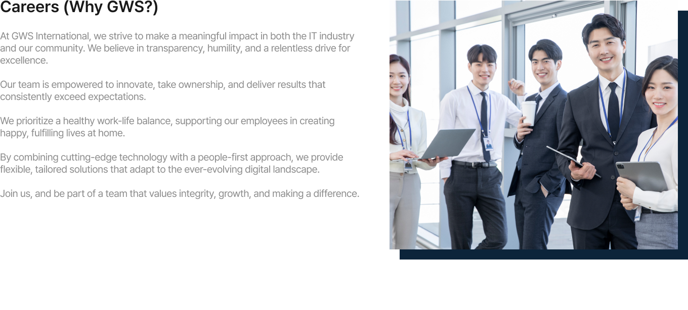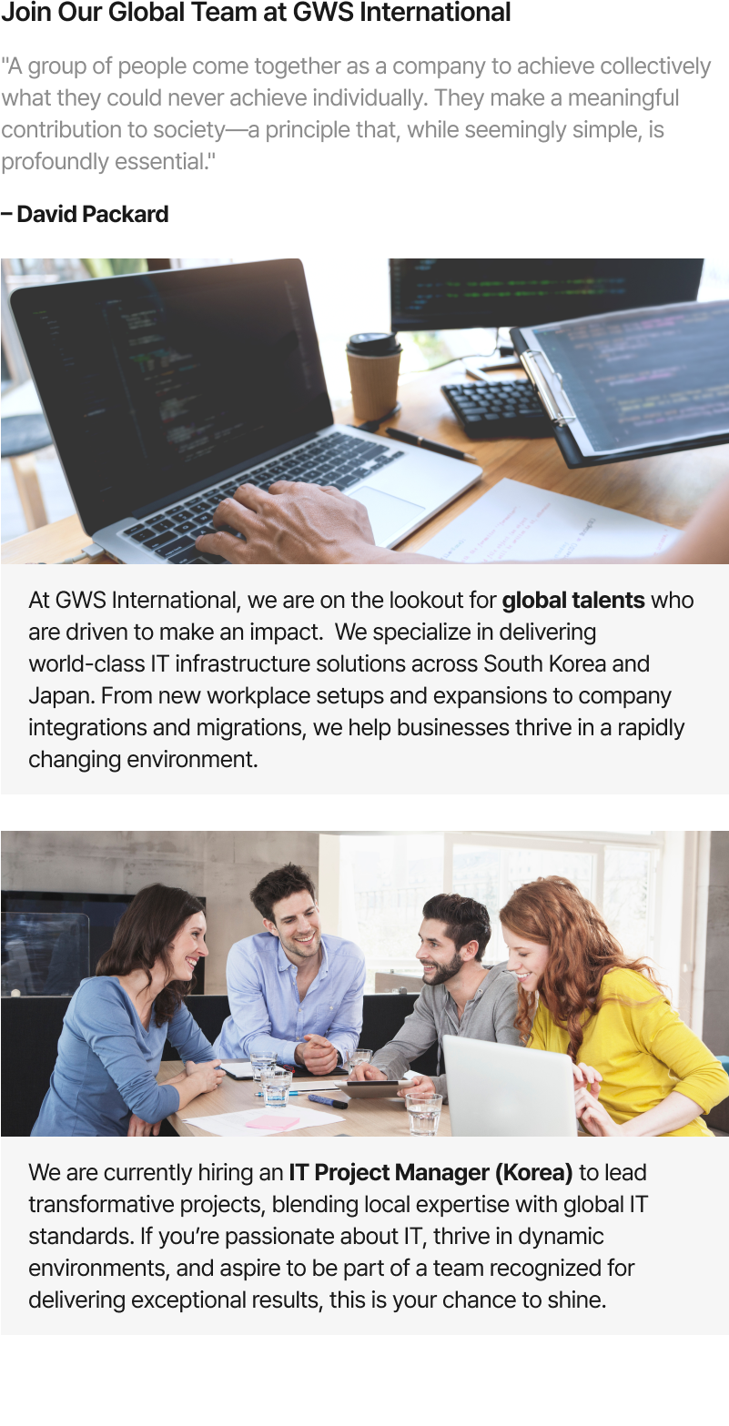 “At GWS International, we deliver tailored ICT solutions that empower businesses globally. From seamless network integration and advanced connectivity to secure SD-WAN and SASE solutions, we support multinational companies entering Korea and Korean enterprises expanding worldwide. Our expertise in infrastructure, NaaS, and end-to-end ICT services ensures your technology drives growth and reliability.”