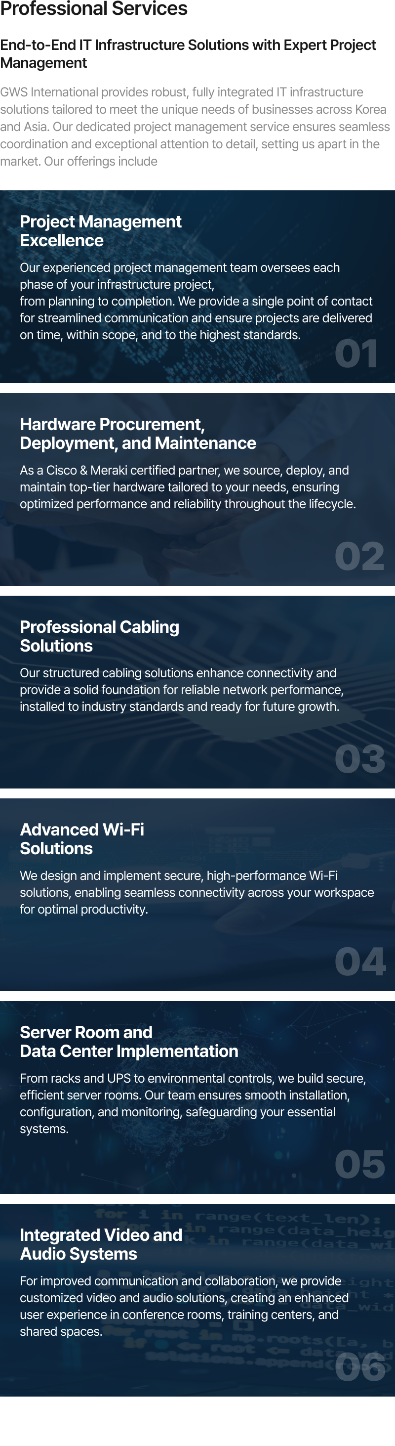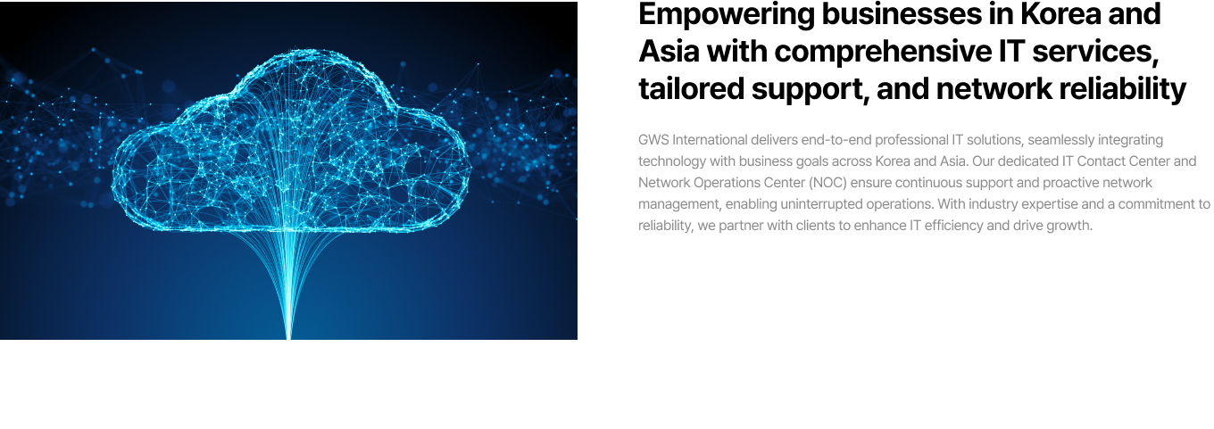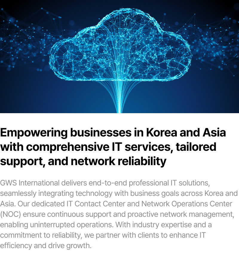 “At GWS International, we deliver tailored ICT solutions that empower businesses globally. From seamless network integration and advanced connectivity to secure SD-WAN and SASE solutions, we support multinational companies entering Korea and Korean enterprises expanding worldwide. Our expertise in infrastructure, NaaS, and end-to-end ICT services ensures your technology drives growth and reliability.”