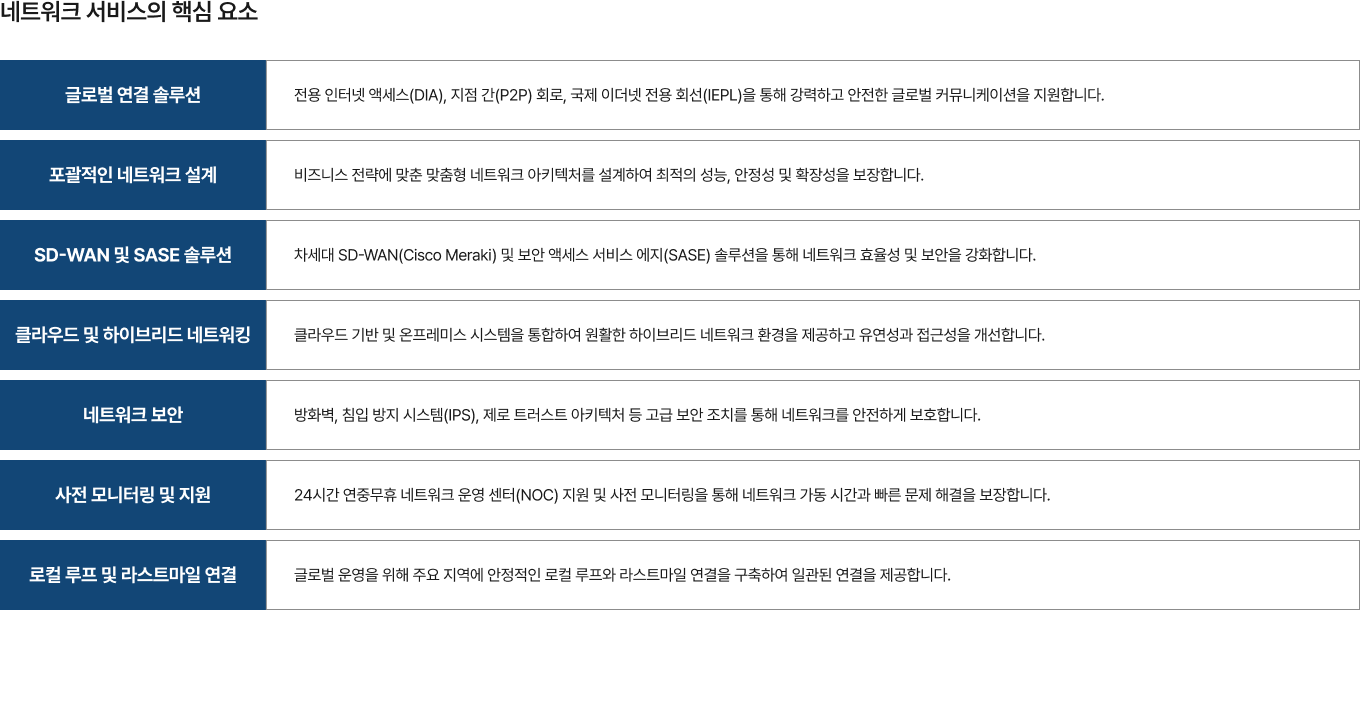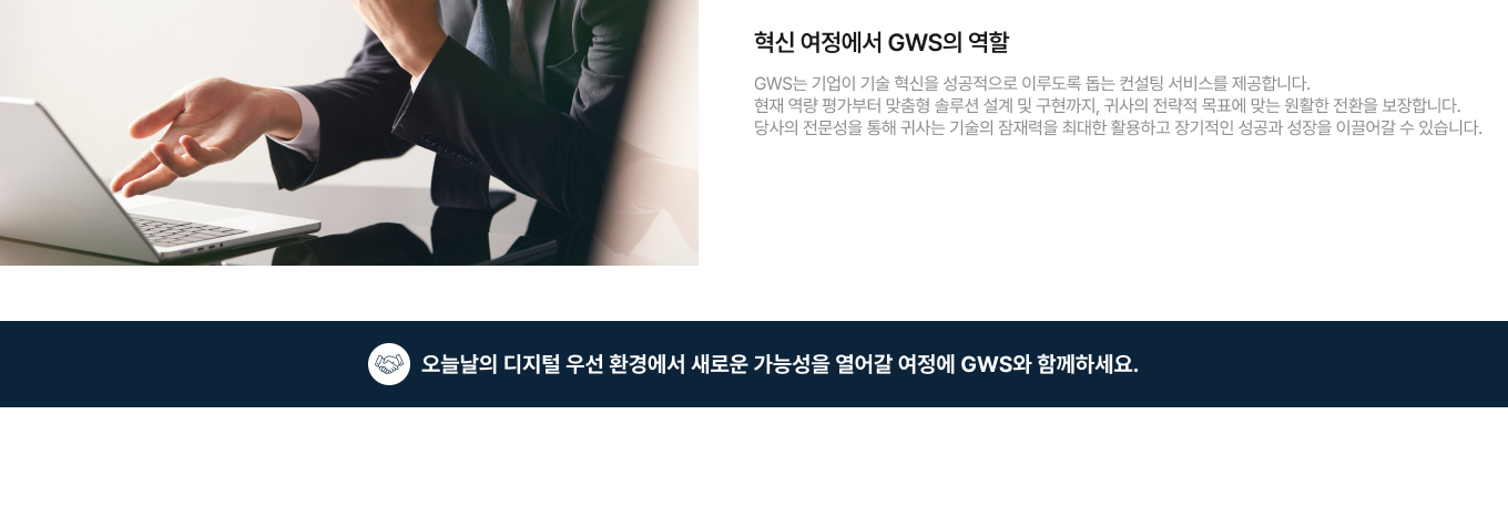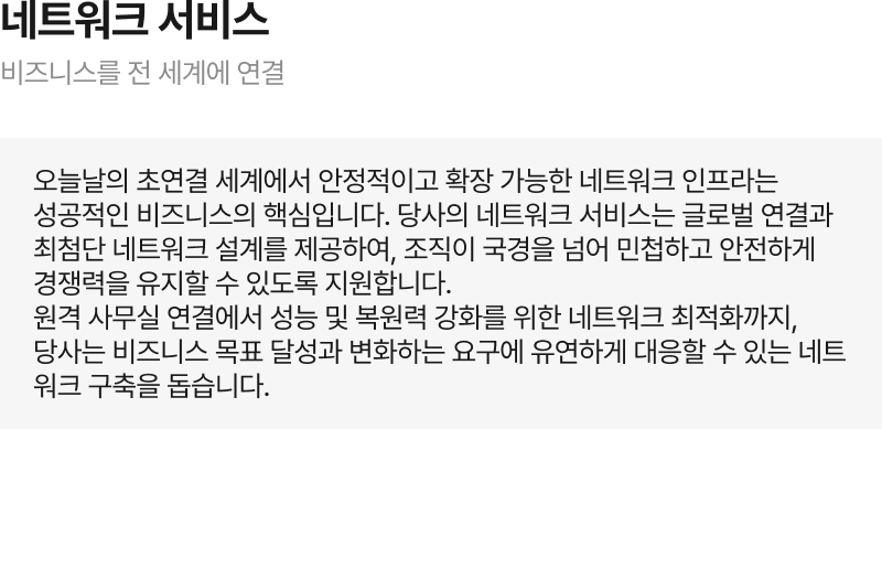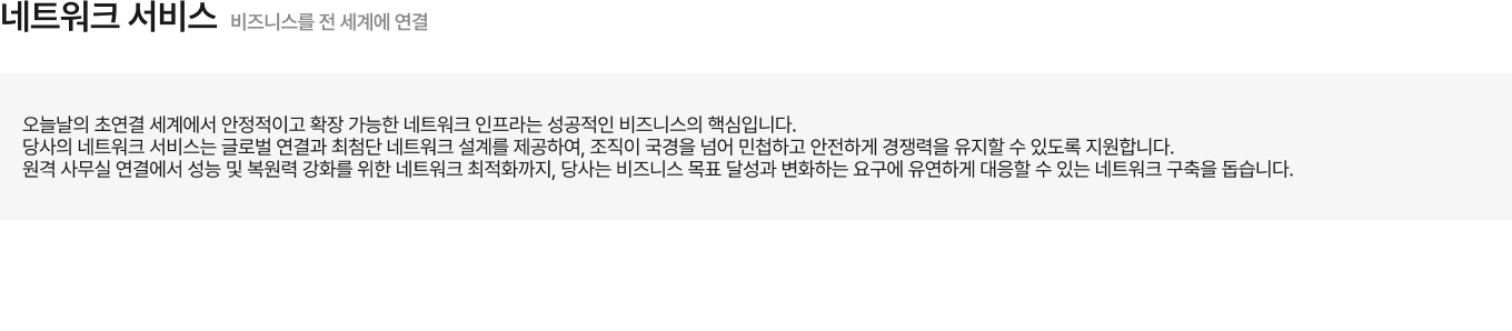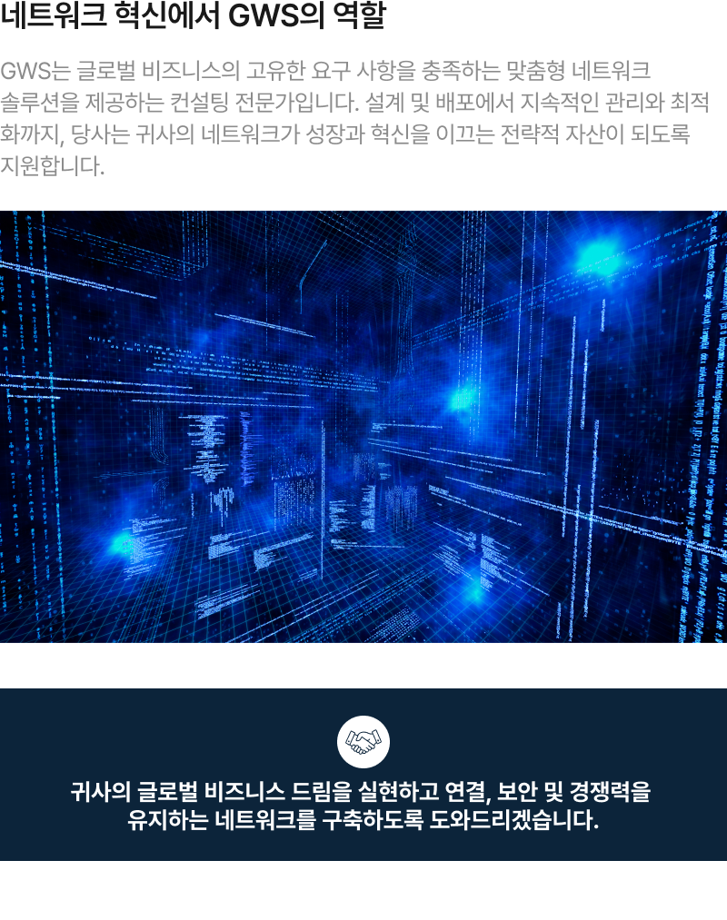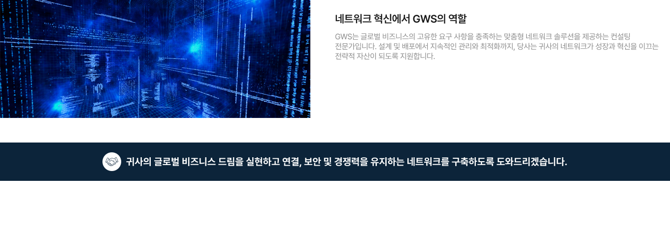 “GWS International은 다국적 기업의 비지니스를 지원하는 맞춤형 ICT 솔루션을 제공합니다. 원활한 네트워크 통합과 연결부터 안전한 SD-WAN 및 SASE 솔루션까지, 한국으로 진출하는 다국적 기업과 글로벌로 확장하는 한국 기업의 성공을 돕습니다. 인프라, NaaS, 그리고 엔드투엔드 ICT 서비스 분야에서 축적된 전문성을 바탕으로, 귀사 비지니스 성장과 안정성을 이끌어낼 수 있도록 최선을 다하겠습니다.”