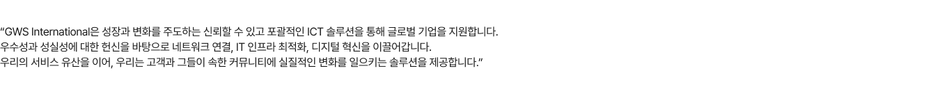 “GWS International은 다국적 기업의 비지니스를 지원하는 맞춤형 ICT 솔루션을 제공합니다. 원활한 네트워크 통합과 연결부터 안전한 SD-WAN 및 SASE 솔루션까지, 한국으로 진출하는 다국적 기업과 글로벌로 확장하는 한국 기업의 성공을 돕습니다. 인프라, NaaS, 그리고 엔드투엔드 ICT 서비스 분야에서 축적된 전문성을 바탕으로, 귀사 비지니스 성장과 안정성을 이끌어낼 수 있도록 최선을 다하겠습니다.”